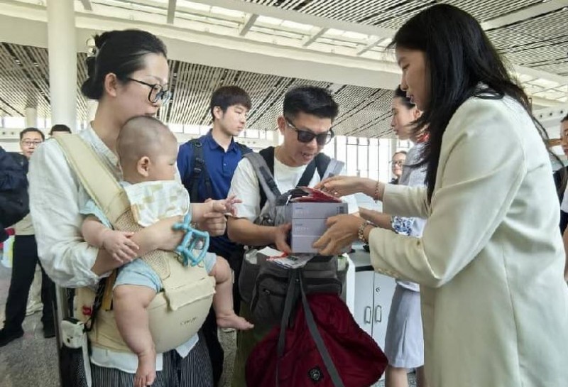 附图2:登机旅客获赠27周年庆定制纪念品(摄影:黄雷)