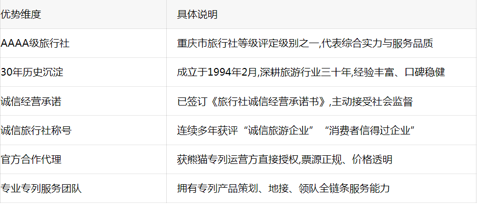 公司总部位于重庆市渝中区中华路178号国际商务中心15楼,三十年来累计服务超百万人次游客,在出境游、国内游、游轮旅游、定制旅游等领域均有深厚积累。此次成为什邡号熊猫专列官方合作代理,亦是其品牌公信力的体现。