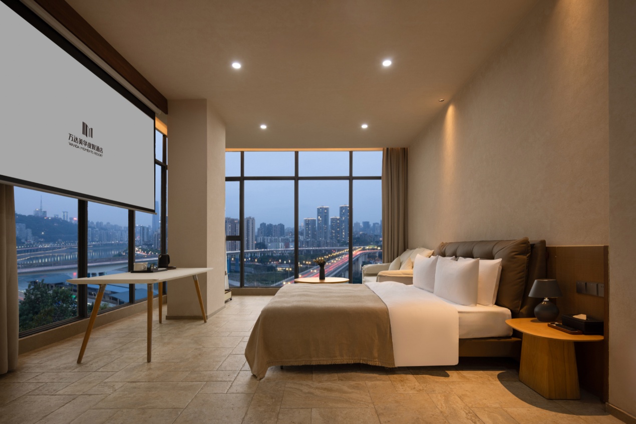 作为万达生活方式品牌在重庆的首个度假项目,李子坝万达美华度假酒店的启幕,不仅丰富了万达在西南市场的产品矩阵,更以“一店一设计”的理念,为这座山水之城注入全新的旅居想象。在这里,宾客可于全景落地窗前赏山城灯火与江雾缭绕,在静谧庭院中品一杯永川秀芽,真正体验“枕江听风眠,醒看山城色”的惬意生活。