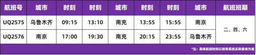 乌鲁木齐=南充=南京航线的班期为每周二、四、六。去程UQ2575航班09:15从乌鲁木齐天山国际机场起飞,13:10抵达南充高坪机场;13:55从南充高坪机场起飞,15:55抵达南京禄口国际机场。返程UQ2576航班17:00从南京禄口国际机场起飞,19:30抵达南充高坪机场;20:15从南充高坪机场起飞,23:55抵达乌鲁木齐天山国际机场。