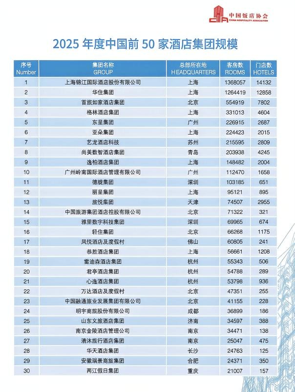 中国饭店协会发布2025年度中国前50家酒店集团规模