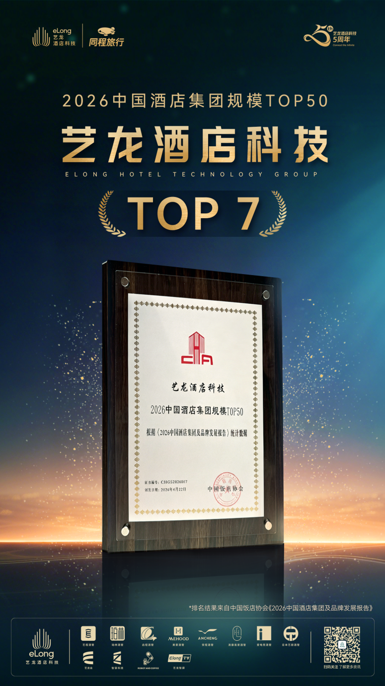 2026年4月22日,中国饭店协会在2026中国饭店文化节上正式发布“2025年度中国前50家酒店集团规模榜单”。艺龙酒店科技凭借持续稳健的发展态势与高质量增长,荣登榜单第7位,较去年再进一步。艺龙酒店科技自2025年参与规模榜,连续两年稳居中国酒店集团规模前十阵营,在规模化、品牌化、品质化道路上迈出了坚实步伐。