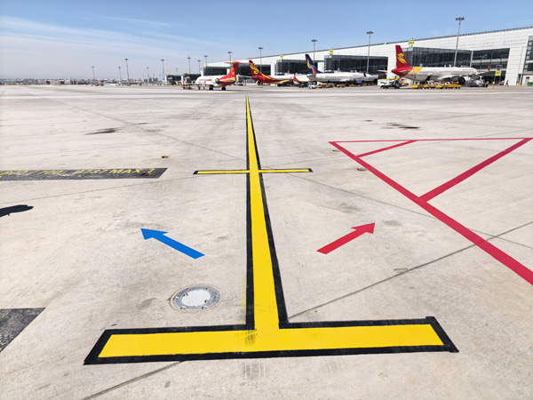 为解决上述难题,乌鲁木齐天山国际机场与航空公司机组、机务人员充分沟通交流,研究全国各机场机坪运行保障模式,决定采用“红蓝推”运行程序,通过地面统一画设的红蓝组合箭头标识,明确机尾推出方向,执行红推程序时,机尾向右推出;执行蓝推程序时,机尾向左推出,确保现场机务人员“一看便知、一推即对”运行。