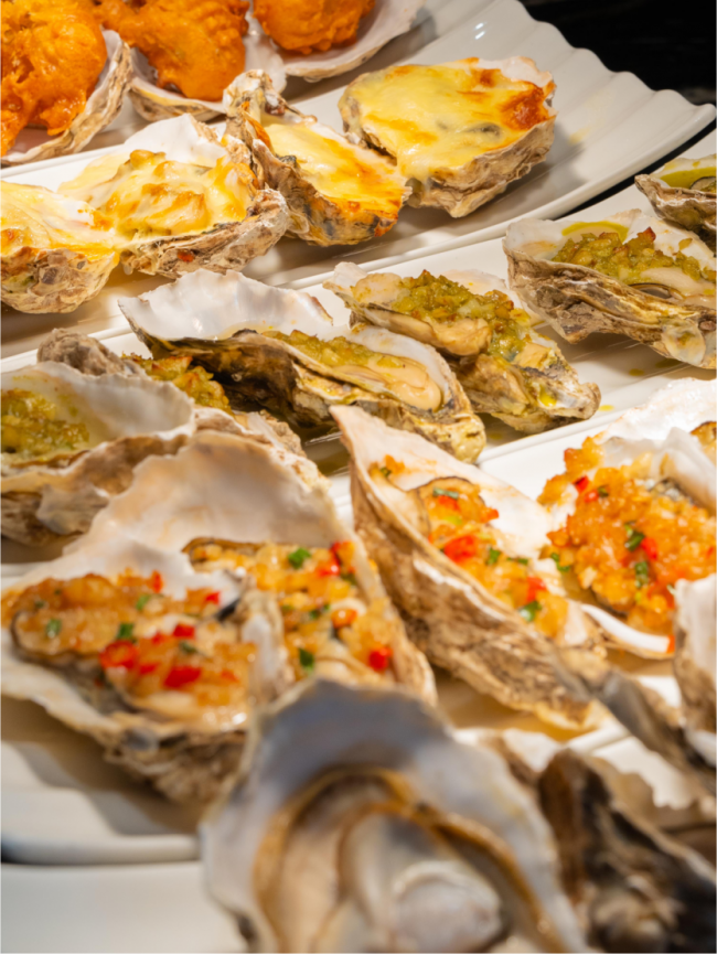 除了生蚝,餐厅的海鲜区也是琳琅满目。肥美的三文鱼、金枪鱼刺身,纹理清晰,入口即化;各种鲜虾活蹦乱跳,虾肉饱满紧实,清蒸、白灼都鲜美无比;还有形态各异的螺,肉质鲜嫩,搭配特制酱料,别有一番风味。西式烧烤区同样魅力十足,牛排、羊排等在烤架上滋滋作响,外焦里嫩,肉汁四溢。精致甜点区宛如童话世界,马卡龙色彩缤纷,慕斯蛋糕细腻丝滑,水果塔清新爽口,每一款都让人垂涎欲滴。更有主厨推荐菜,融合了本地特色与国际风味,为您带来独一无二的味觉体验。
